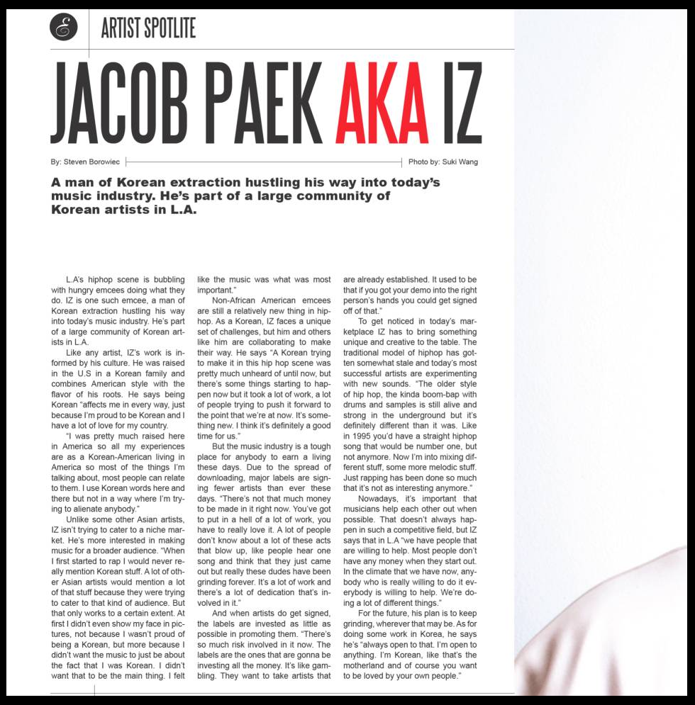 IZ has been featured in the latest issue of Eloquence. They talk a lot about his heritage and how hard it is to break into the industry, even disregarding ethnicity. A great feature for the California artist and we hope to see more of him in the near future. Check out the actual spread over at Eloquence, once you get it loaded (the flash interface can be a little buggy) navigate to page 65.