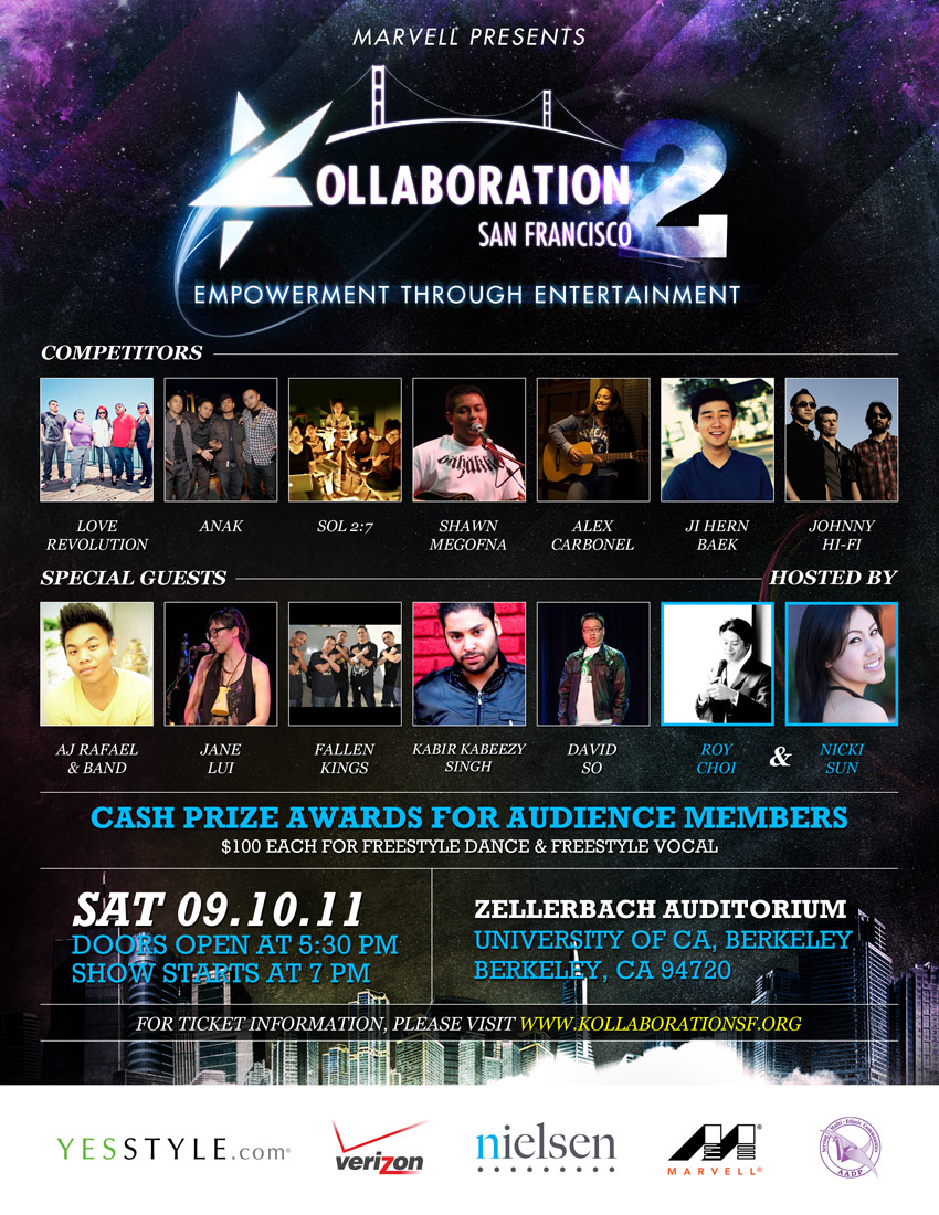 Kollaboration SF is back for its second year and have announced the participants and guest stars that will grace the stage for this great event. Competitors this year include Love Revolution, Sol 2:7, Johnny Hi-Fi, Alex Carbonel, Shawn Megofna, Ji-hern Baek and ANAK. Guest stars that have come to give us awesome performances include: AJ Rafael, Jane Lui, Fallen Kings, Kabir ‘Kabeezy’ Singh and comedian David So. They also released a snippet of the contestants and plan to release a cover of Jessie J’s “Price Tag” later this month. Click here to order your tickets and check the video after the jump!