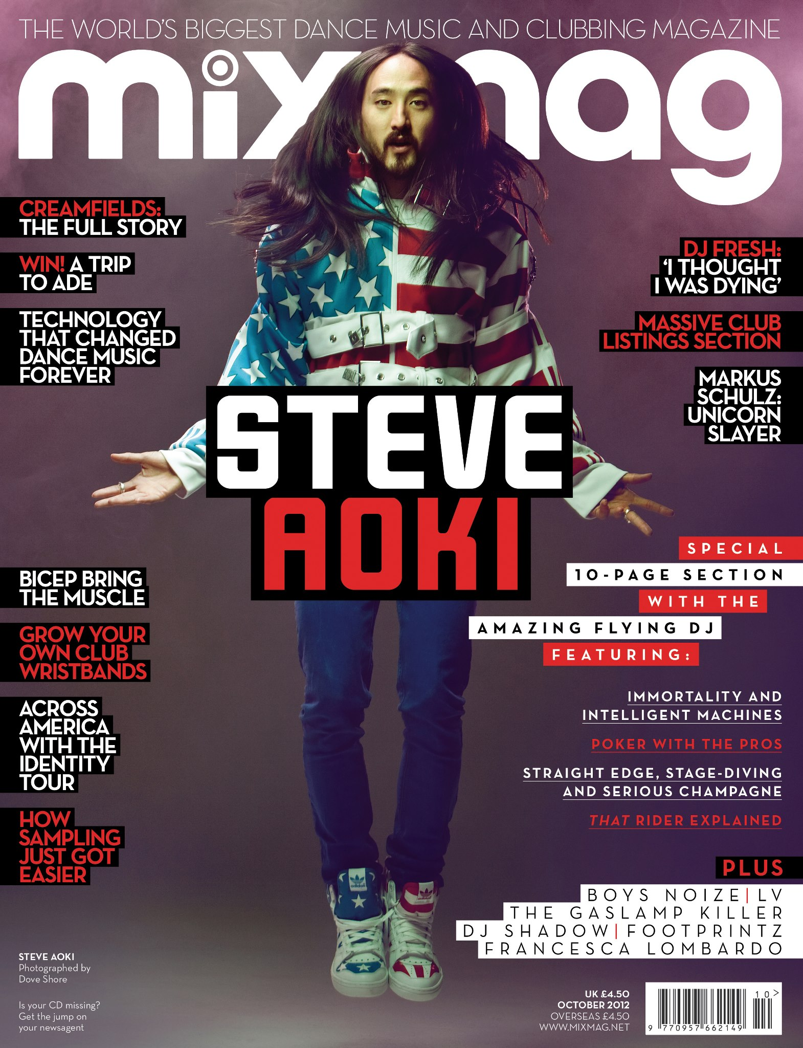 EDM heads and clubbing regulars, take notice cause Steve Aoki has landed himself on the cover of the latest (October 2012) issue of Mixmag. The artist gets 10 pages dedicated to his feature interview where they cover the following: